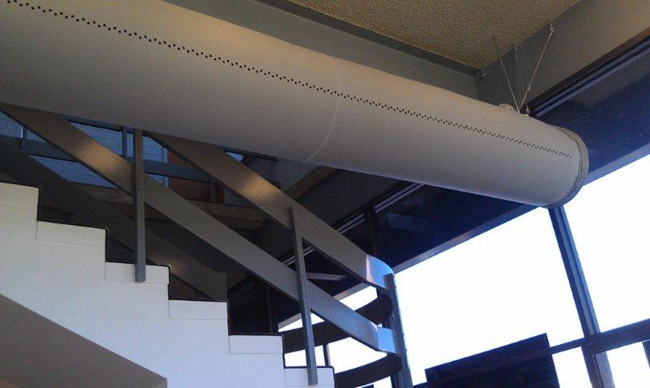 織物空氣分布系統(tǒng)是由特殊纖維織成的柔性空氣送分系統(tǒng),俗稱布袋風(fēng)管,是一種新型的末端送風(fēng)系統(tǒng)。它以均勻舒適送風(fēng),防凝露,重量輕,防水,安裝工期短受到越來越多的歡迎。